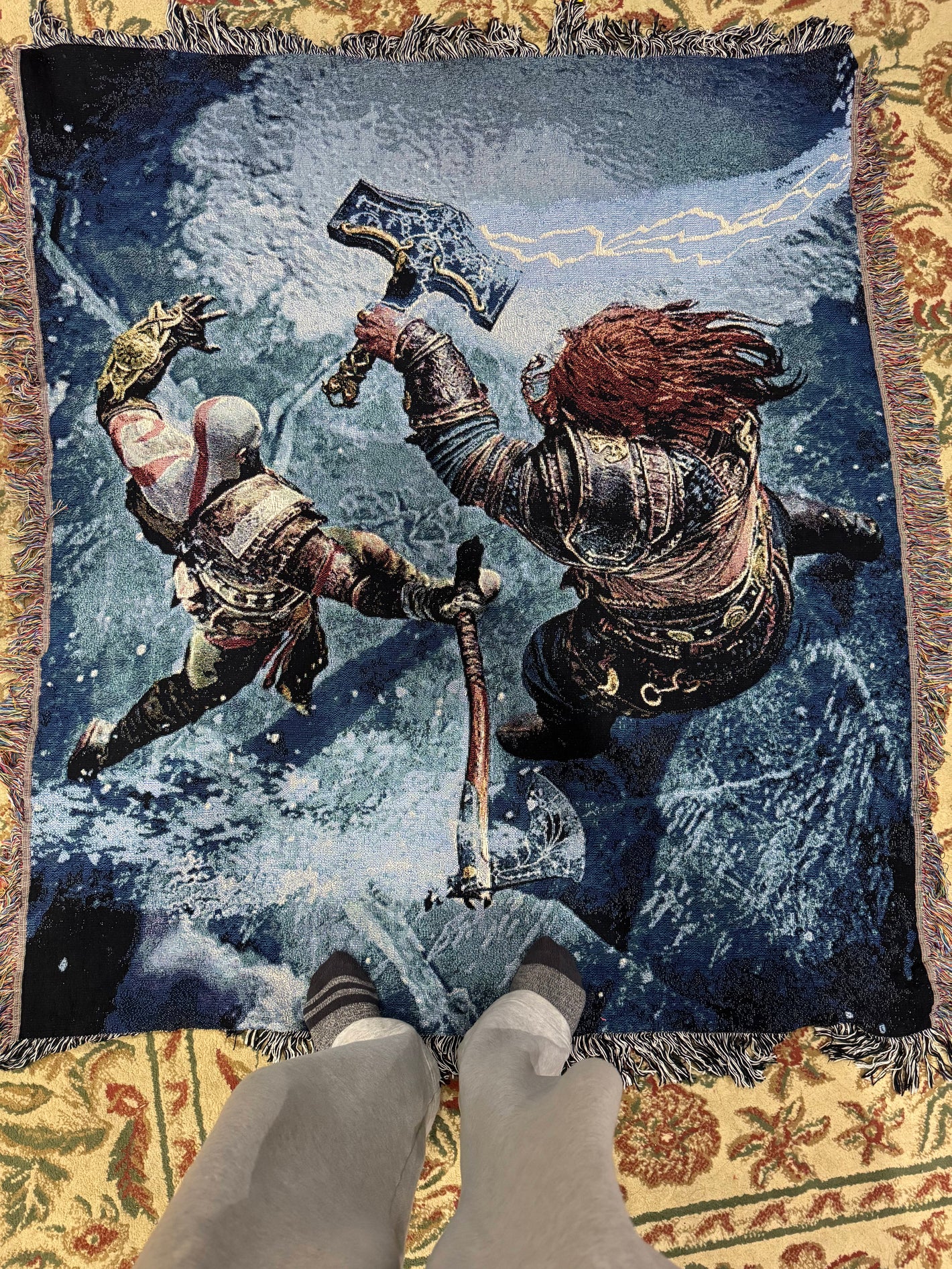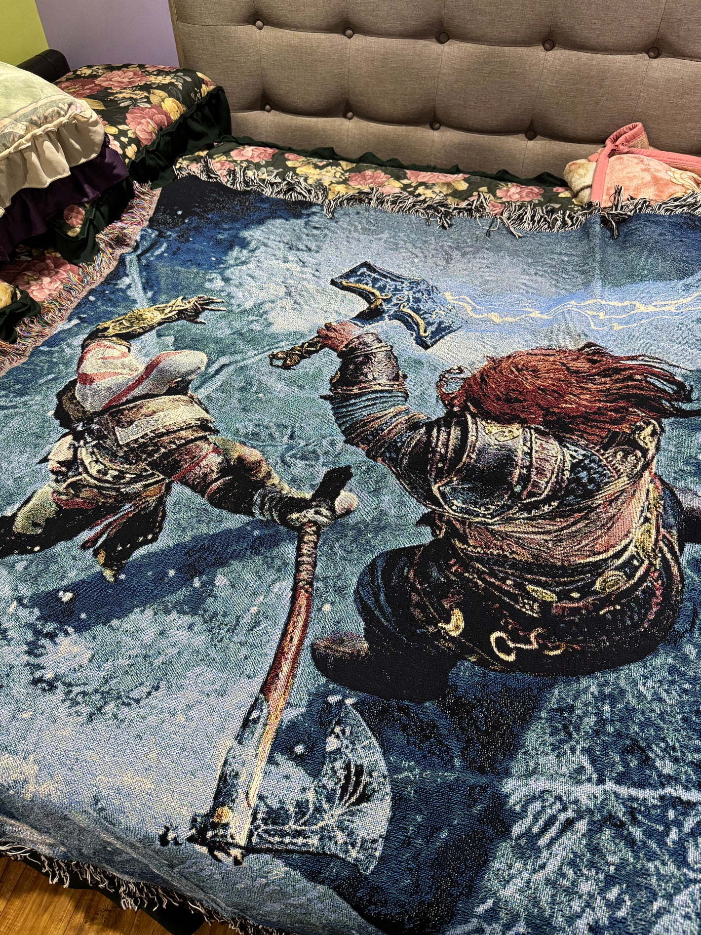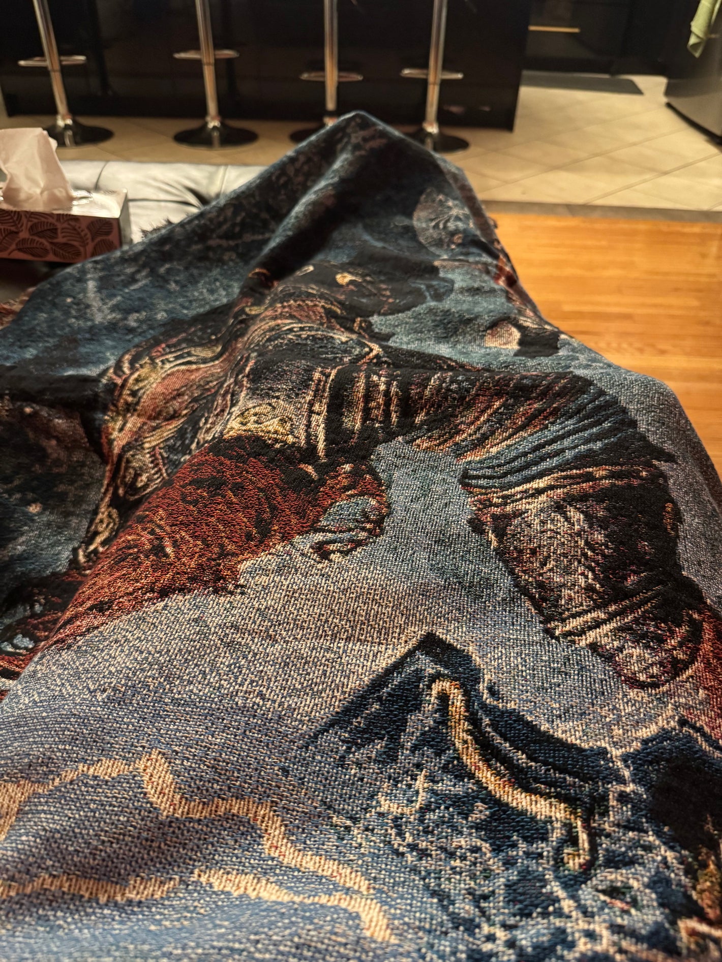 He ripped it open and loved the weight and print quality — looks like a high-end throw. Holds up after a wash too.
